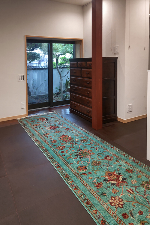 また別のお部屋に続く廊下には同じターコイズブルーのガズニン絨毯を。