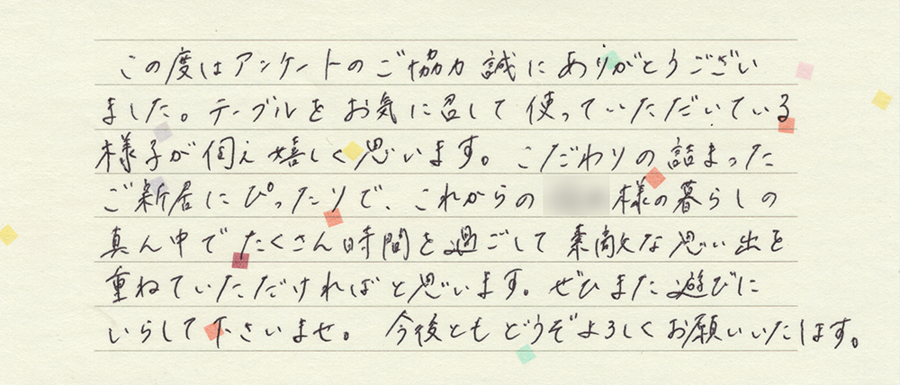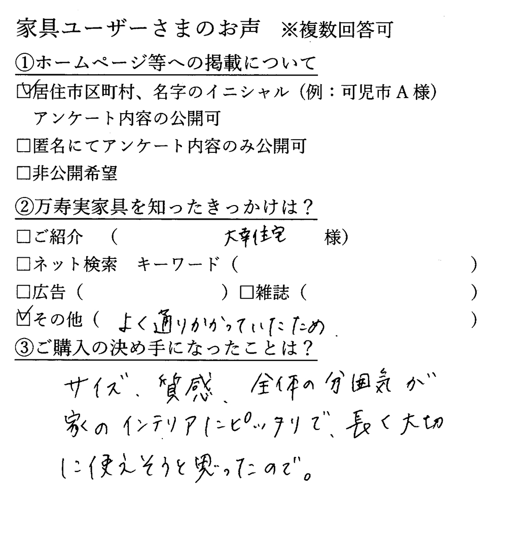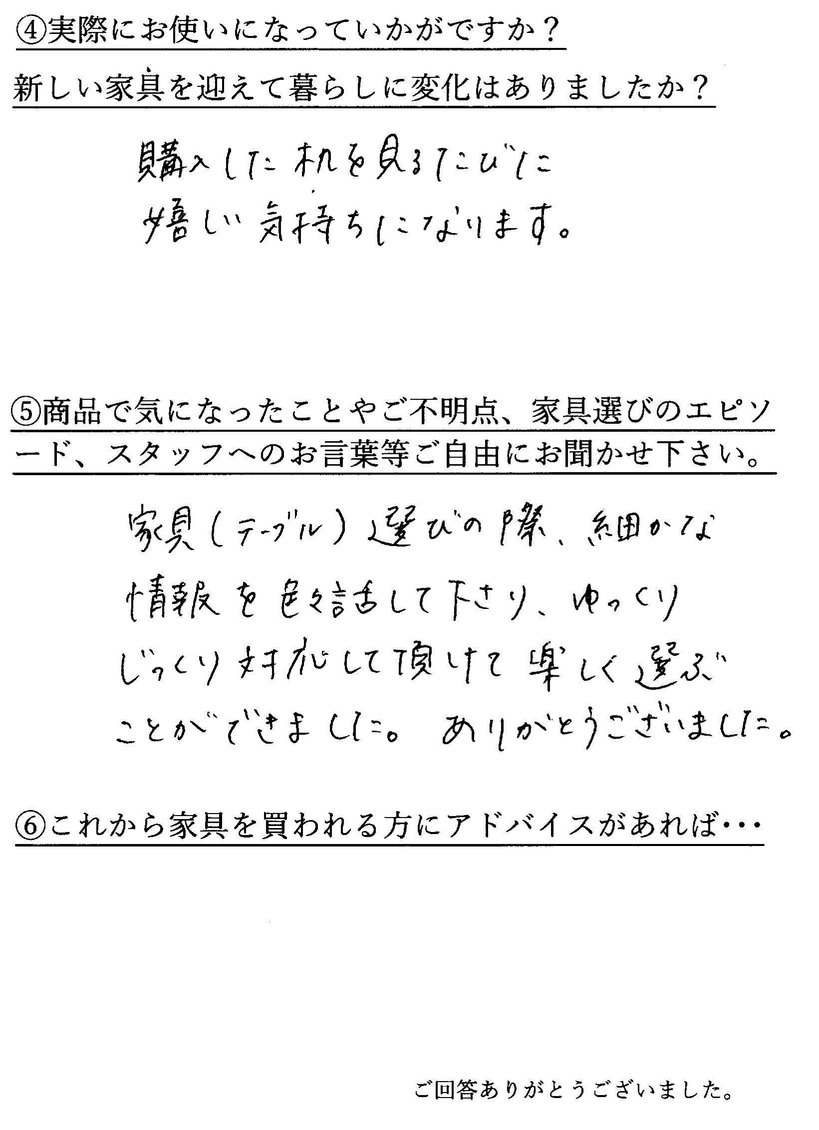 家具ユーザー様の声 ~ダイニング~ 購入した机(テーブル)を見るたびに嬉しくなります 岐阜県可児市 F様より <ご愛用の家具> ・テーブル:オリジナルセレクト ・チェア:エドワードチェア スタッフより F様の納品事例はこちら ダイニング オリジナルセレトについてはこちらから 一覧に戻る